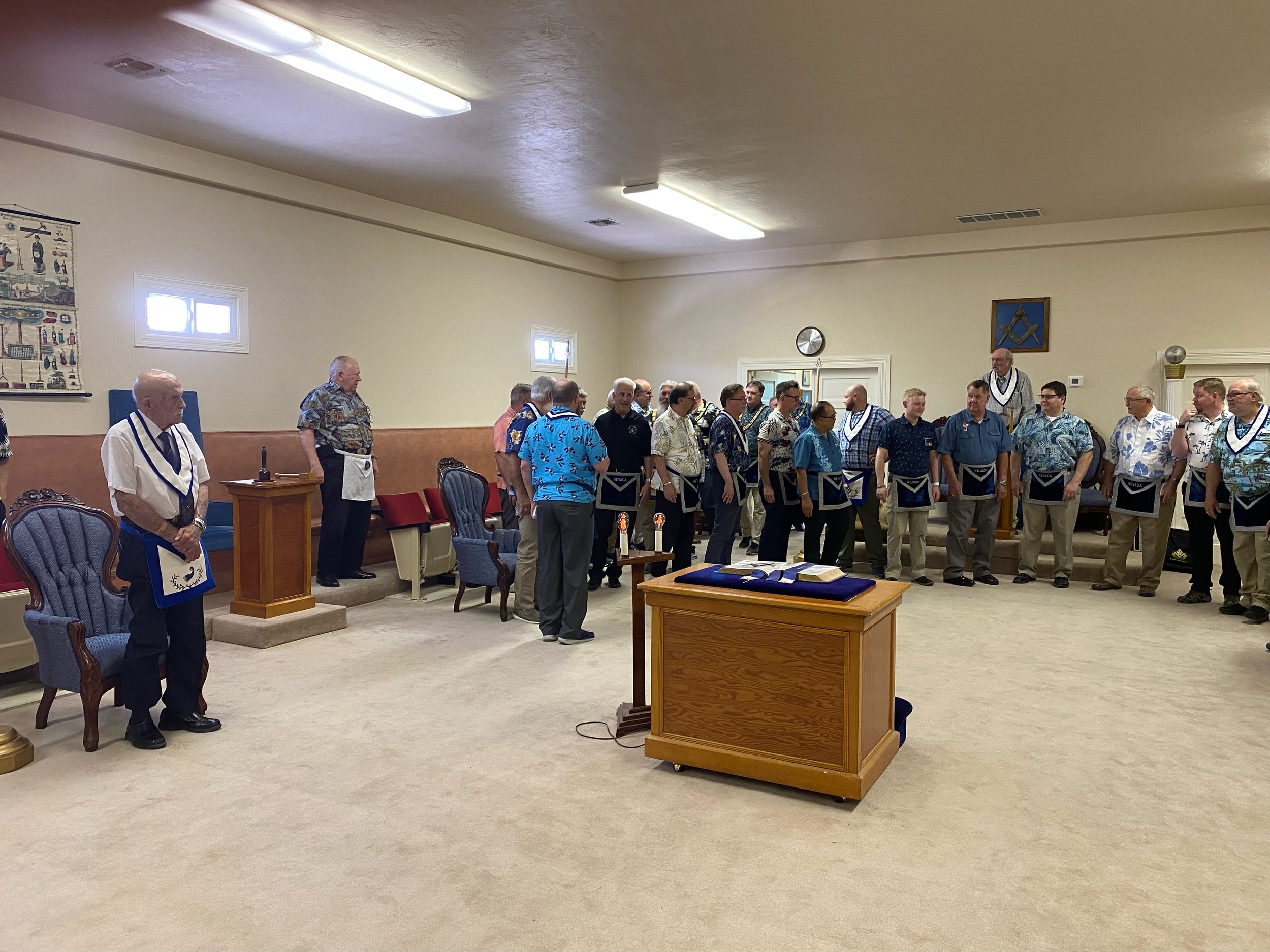 On Saturday, July 15th, Most Worshipful Kevin P. McCans, Grand Master of Masons in Nevada, performed his official visit to Hope #22 in Yerington, NV. Several Grand Lodge Officers accompanied the Grand Master. The Worshipful Master called a Hawaiian night in honor of the visit.